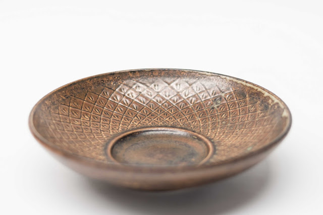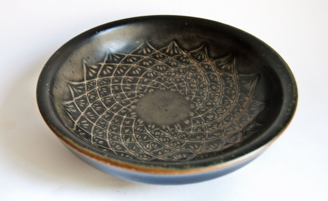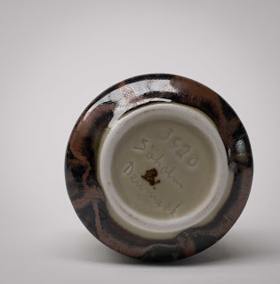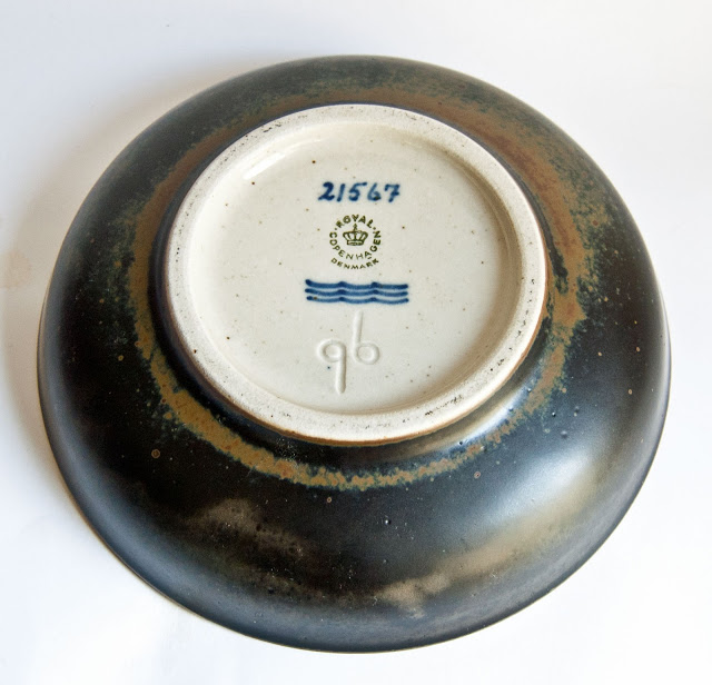 She is best known for her beautifully and intricately patterned stoneware pieces at Royal Copenhagen, typical of the example below, but did also design some equally impressive porcelain pieces - often with blue or celadon glazes.